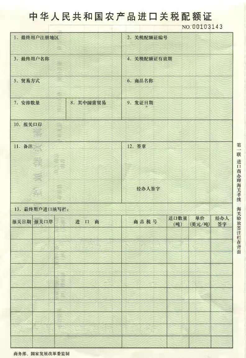 | 办结时限 | (一)羊毛、毛条、食糖:每年1月1日前,向进口最终用户发放进口关税配额证明。 |