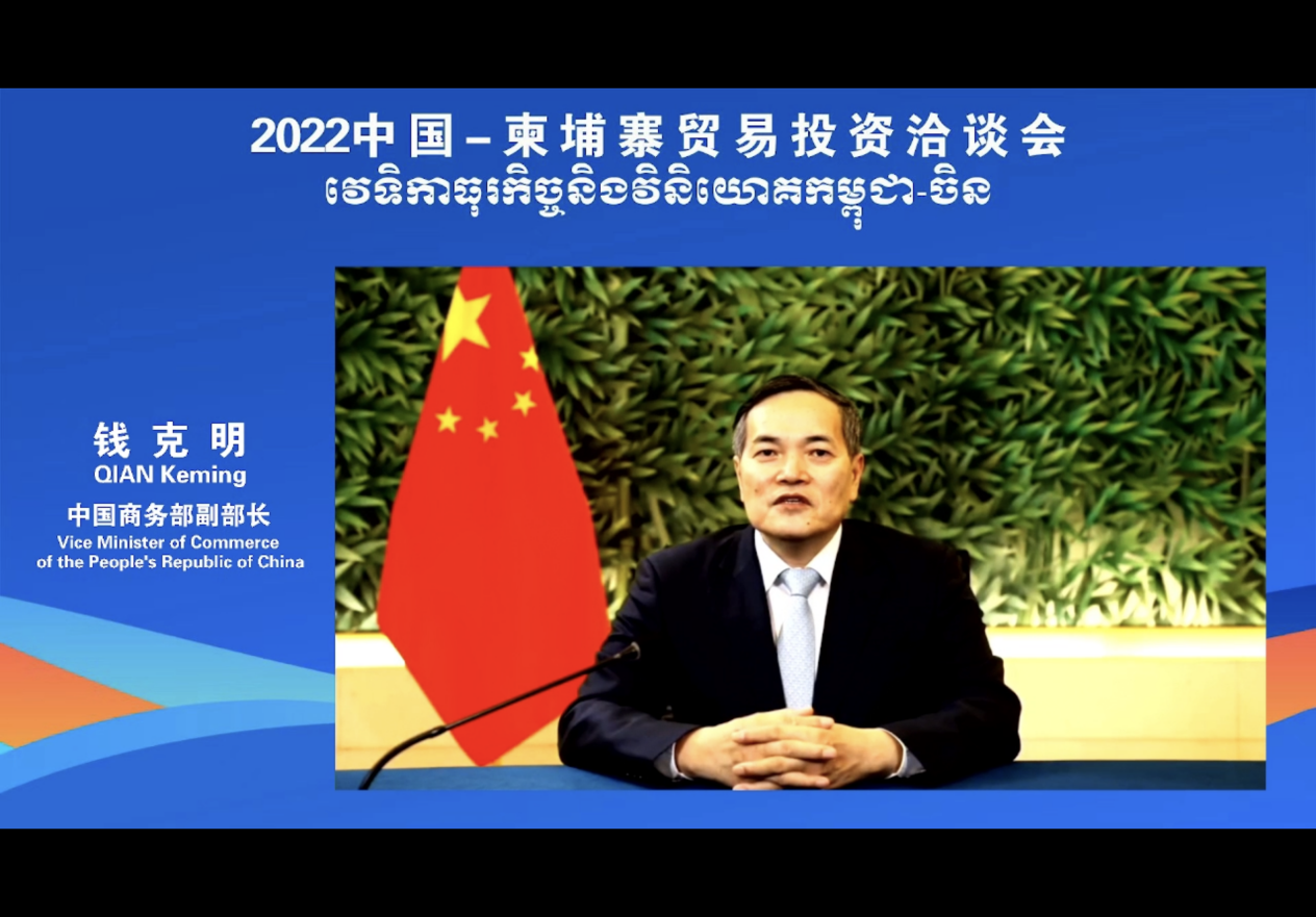5月18日,bet28365365娱乐场_365跑腿客服电话号码_必发365一些奖金副部长钱克明在2022中国—柬埔寨贸易投资洽谈会上发表视频致辞。柬埔寨商业部国务秘书森泰出席并致辞。2022中国—柬埔寨贸易投资洽谈会由bet28365365娱乐场_365跑腿客服电话号码_必发365一些奖金、中国驻柬埔寨大使馆、柬埔...